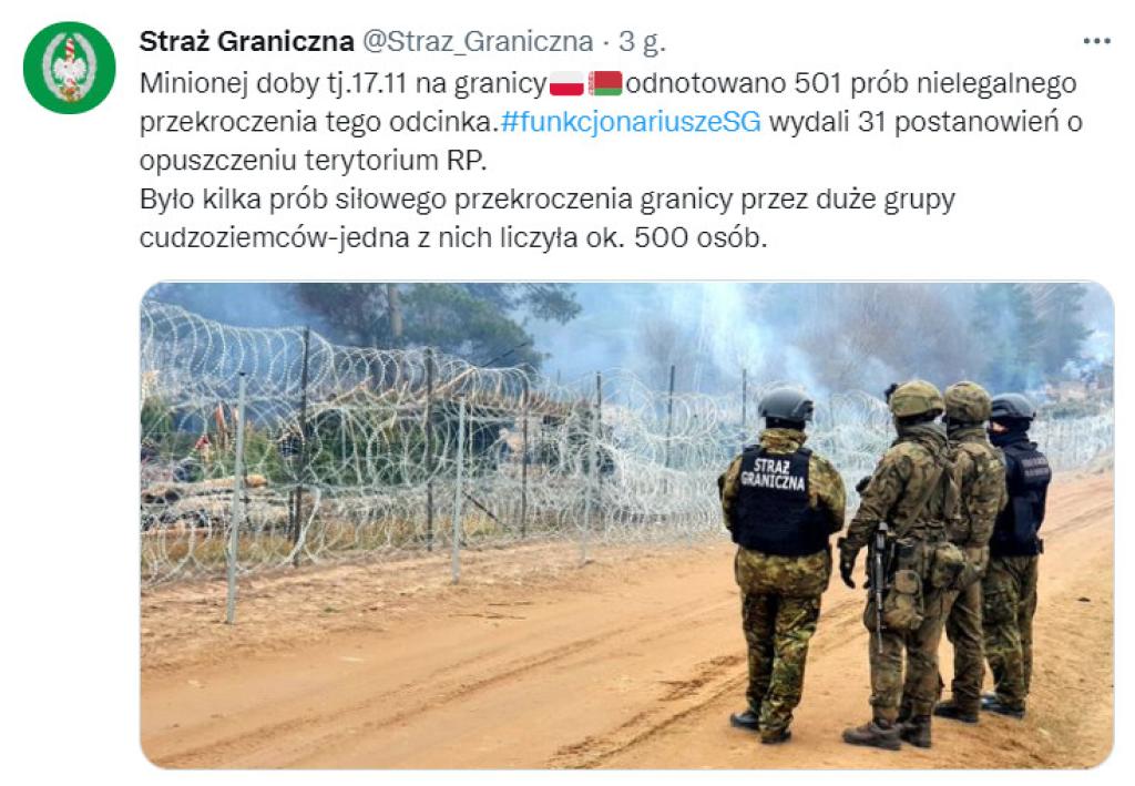 Funkcjonariusze SG wydali 31 postanowień o opuszczeniu terytorium RP. Było kilka prób siłowego przekroczenia granicy przez duże grupy cudzoziemców - jedna z nich liczyła ok. 500 osób.